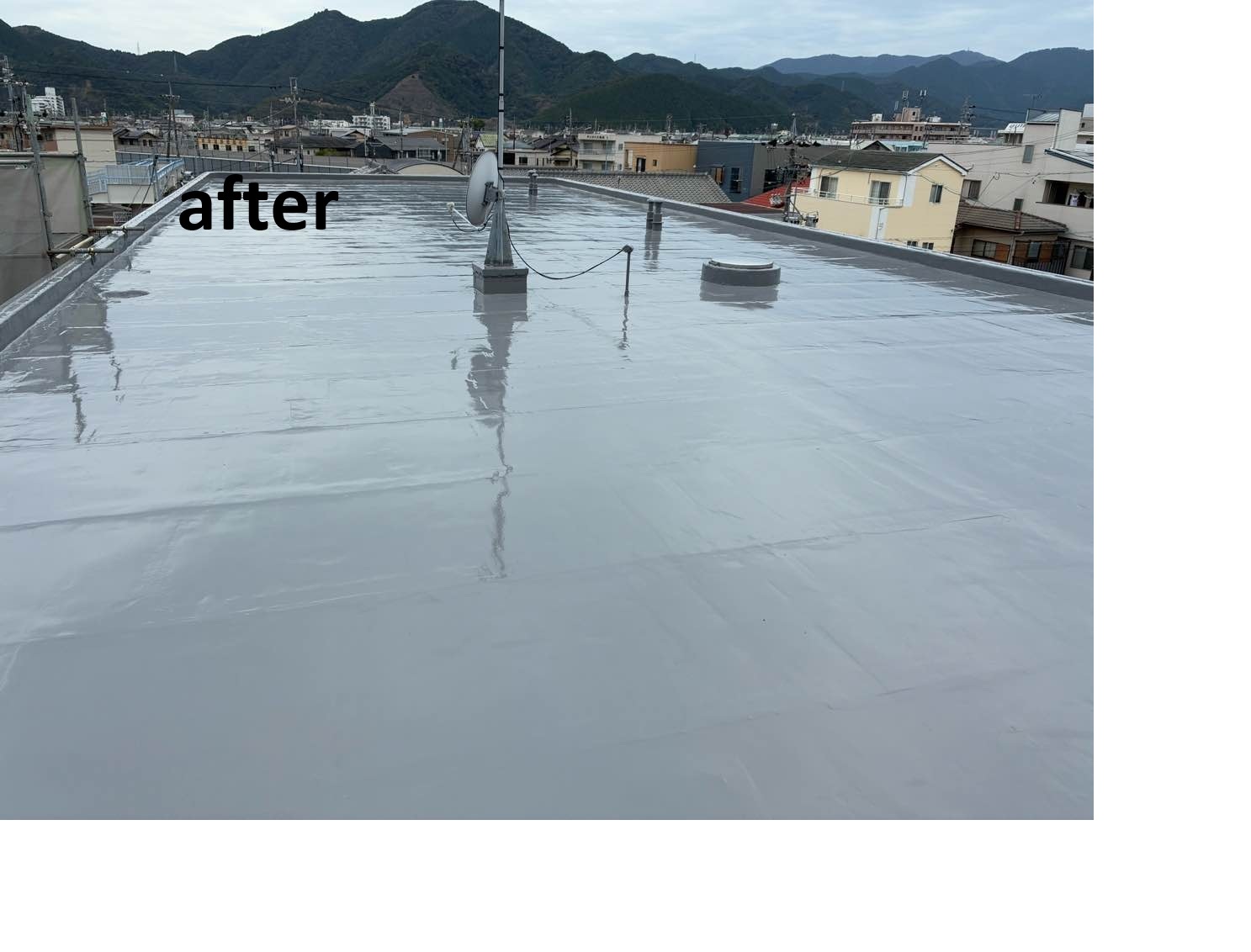 屋上防水工事 こちらは3階建ての集合住宅です。以前に弊社で外壁の改修工事をさせていただきました。屋上防水についてお問い合わせがあり、現調をしましたところ防水効果が無い状態だった為、ウレタン塗膜防水をご提案しました。今回の屋上改修工事もお任せいただき、とても光栄です。