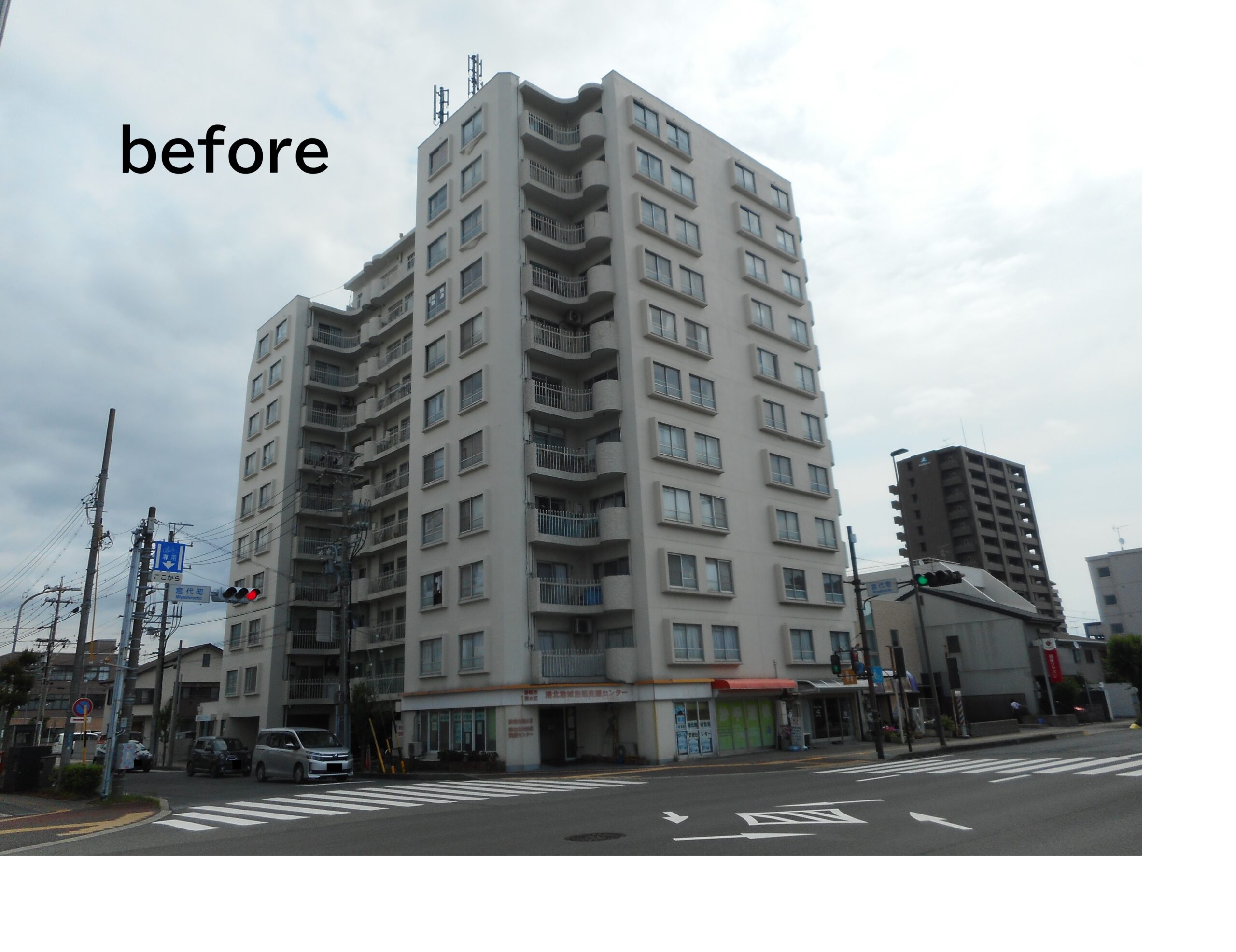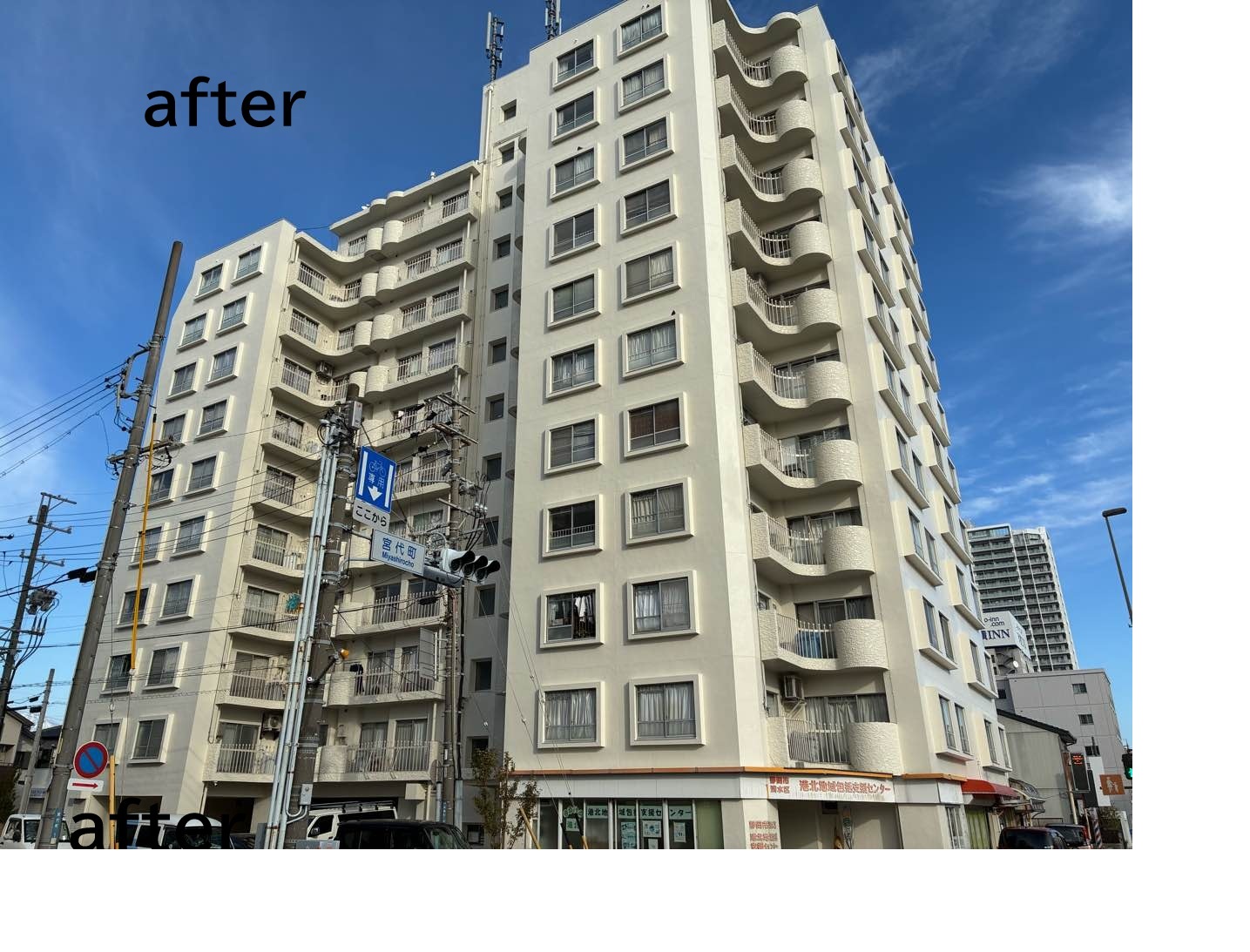 外壁塗装工事/各所塗装工事/バルコニー床防水工事/階段室屋上防水工事/シーリング工事/各所補修工事 こちらは12階建ての分譲マンションです。今回は大規模修繕工事をお任せいただきました。JR清水駅近くに立地していることもあり、外壁には淡彩色を使用いたしました。明るく優しい印象に仕上がり、ご入居者様からも「以前より凄く明るくなった!」と喜びのお声をたくさんいただきました。