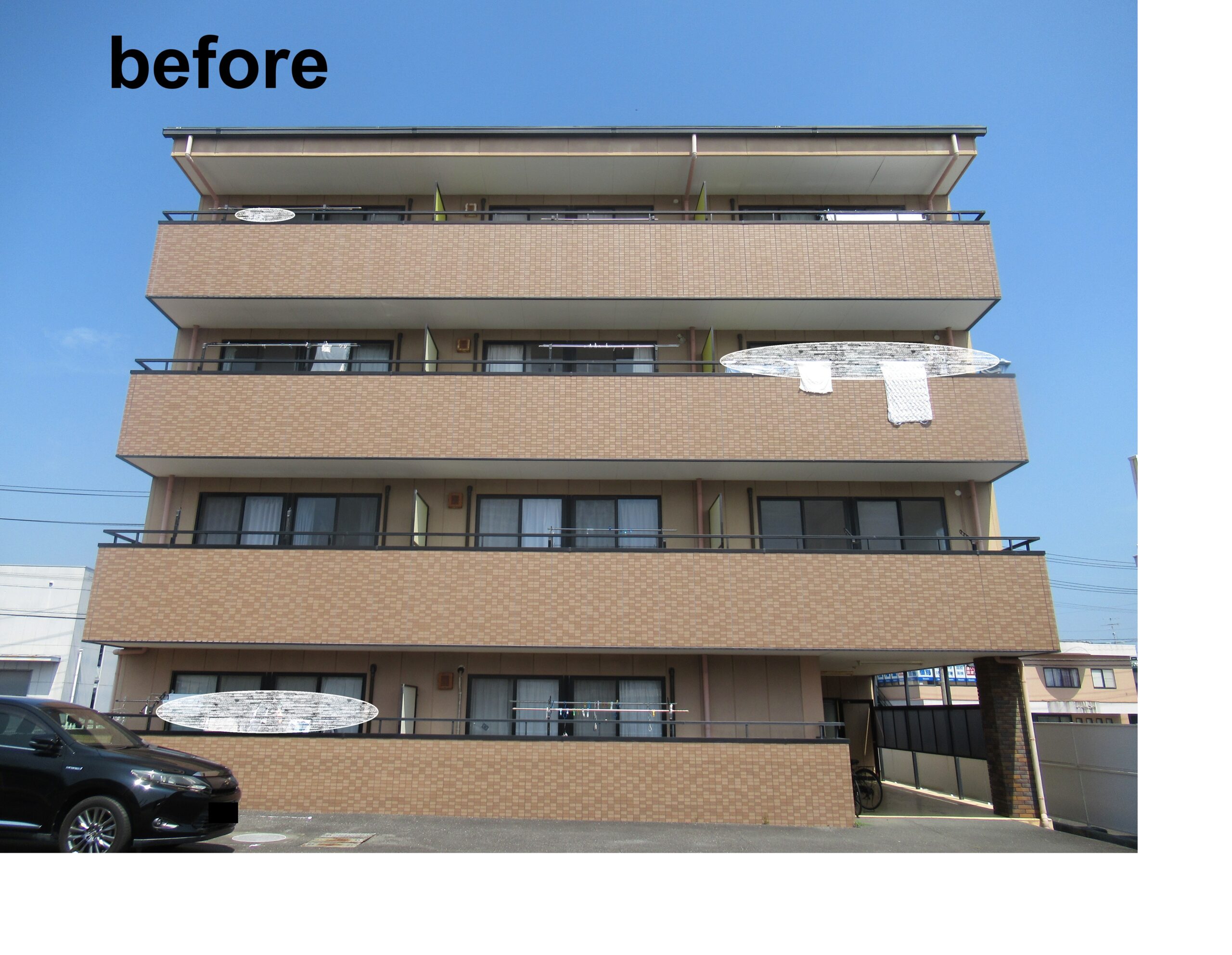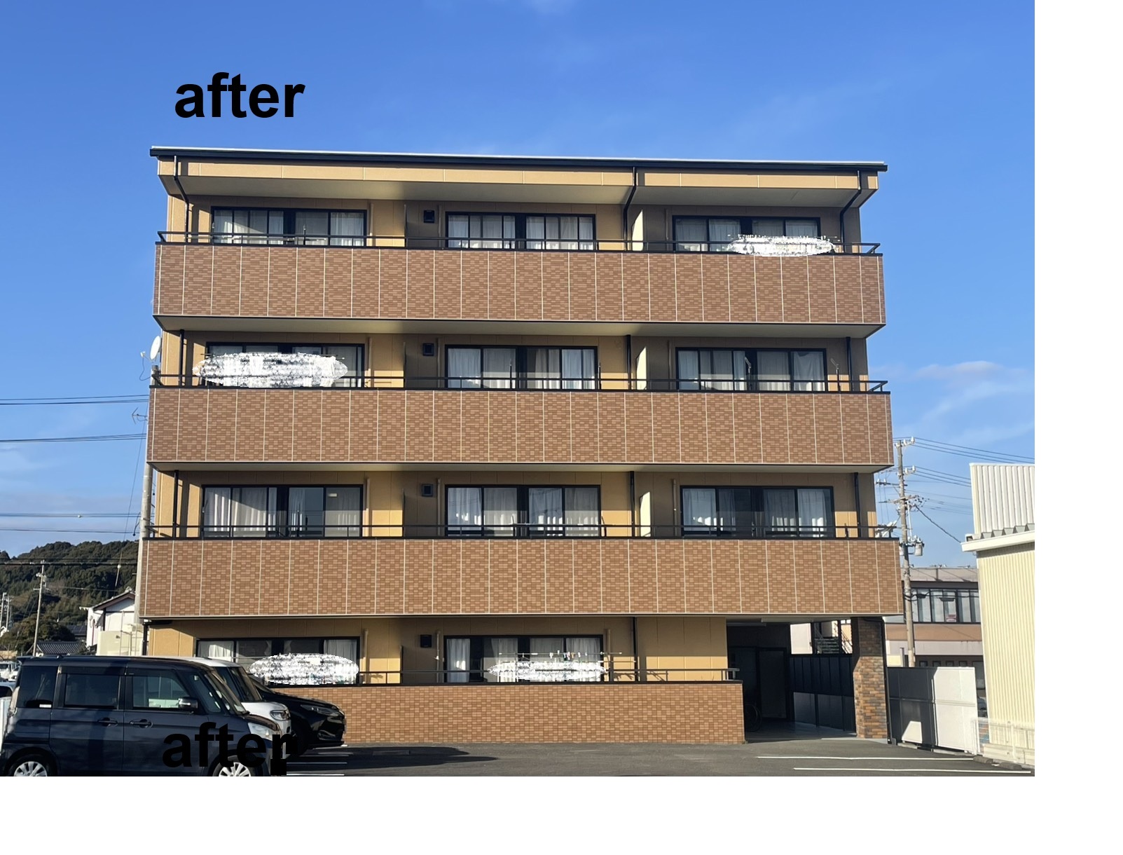 外壁塗装工事/シーリング工事/タイル打診調査 こちらは4階建ての集合住宅です。今回はALCおよびタイル壁の塗装工事をさせていただきました。下地にはKFタイルホールドを使用し、既存タイルへの密着性を高めたうえで塗装を行っております。タイルの剥離リスクを抑え、耐久性と美観を兼ね備えたお仕上がりとなりました。