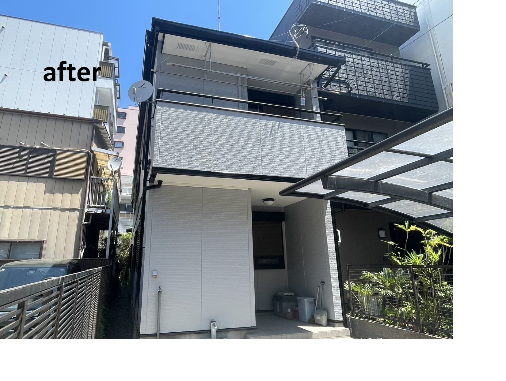 外壁塗装工事/屋根塗装工事/シーリング工事/天窓修繕工事/雑草樹木撤去                こちらは2階建ての住宅です。新築から塗り替えをされていませんでした。ツタが張り巡ってしまい、全て綺麗に取り除いてから塗装しました。今回の施工では、イメージをそのままに同色での塗装をご希望でした。塗装後は経年による劣化や色褪せが無くなり、明るい印象に仕上がりました。この機会にご自宅前の植木も綺麗にしたいとのご要望がございましたので、植木等も整えさせて頂きました。