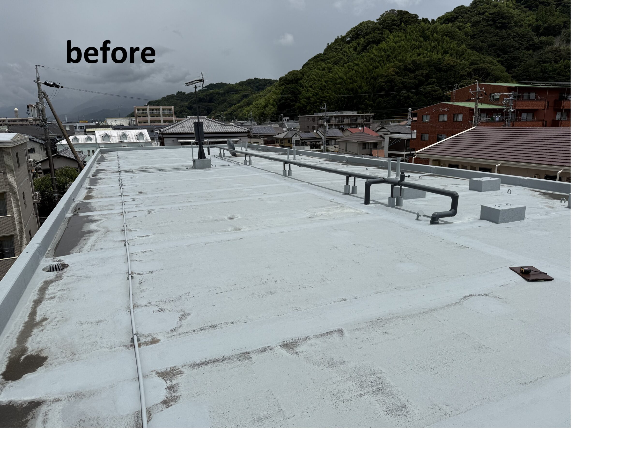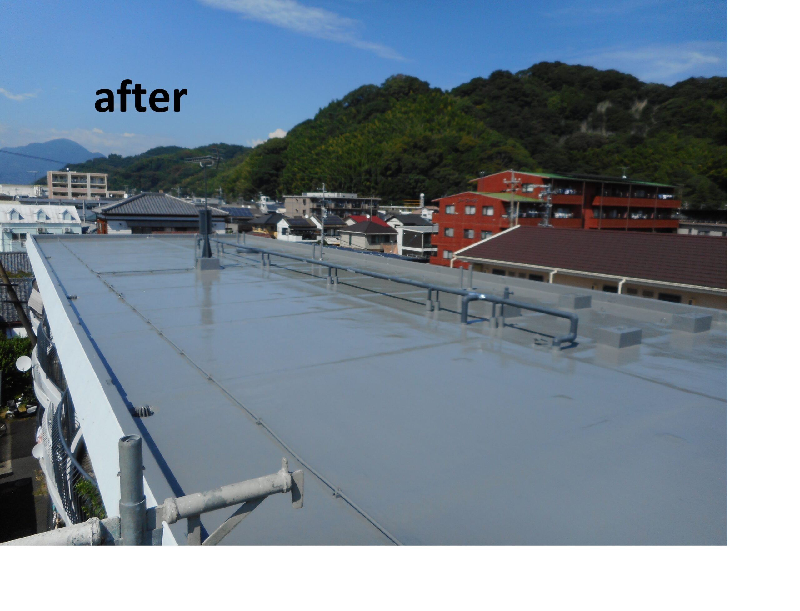 屋上防水工事           こちらは3階建ての集合住宅です。以前に弊社で外壁塗装工事をしており、今回は屋上防水工事(ウレタン塗膜防水)をご依頼頂きました。ウレタン塗膜防水は、液体状のウレタン樹脂を塗り重ねて防水層を形成する工法で、継ぎ目のないシームレスな仕上がりが特徴です。コストパフォーマンスが良く、複雑な形状の場所にも施工可能で、高い防水性を発揮します。また、弾性があり、建物の動きに追従するため、ひび割れや漏水のリスクを軽減できます。今回も仕上がりにご満足して頂くことが出来ました。