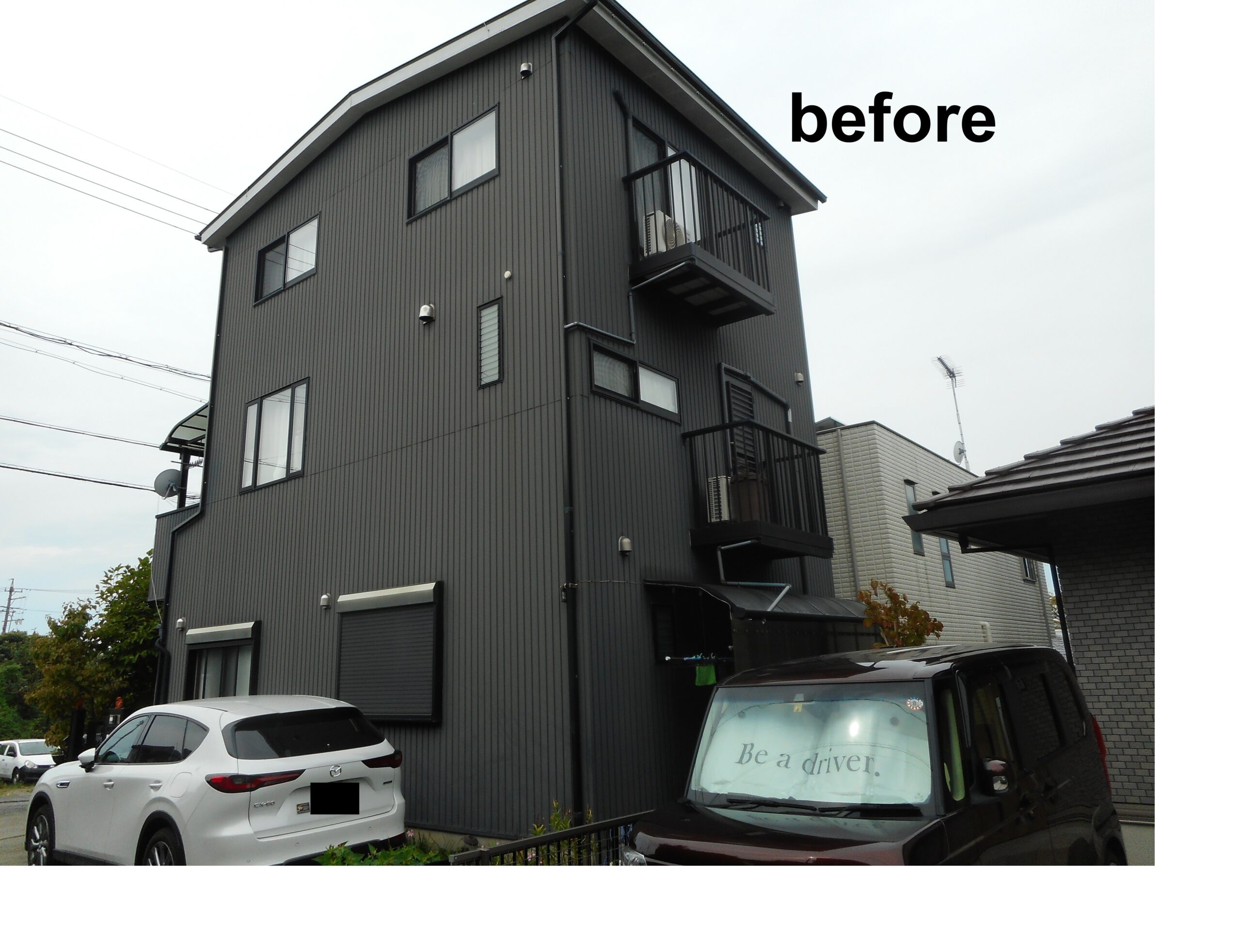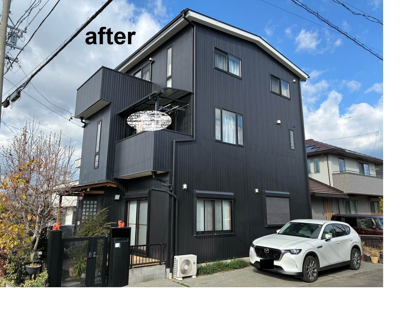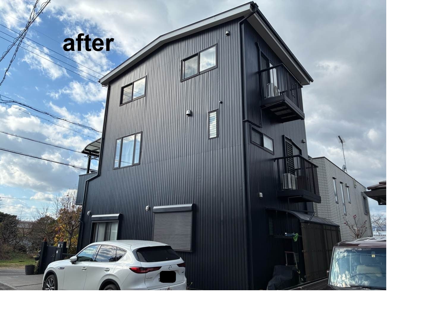 外壁塗装工事/屋根塗装工事/シール工事/モルタル補修工事      こちらは3階建ての住宅です。お施主様のご意向で、外壁は3分艶のブラックを使用いたしました。高級感のある落ち着いた雰囲気に仕上がりました。  3分艶とは、艶消し塗料の一種です。艶ありと艶なしの中間的な光沢で、マットで落ち着いた印象を与えてくれます。艶あり、艶なしはそれぞれ良さがありますので、お悩みの際はお気軽にお問い合わせください。